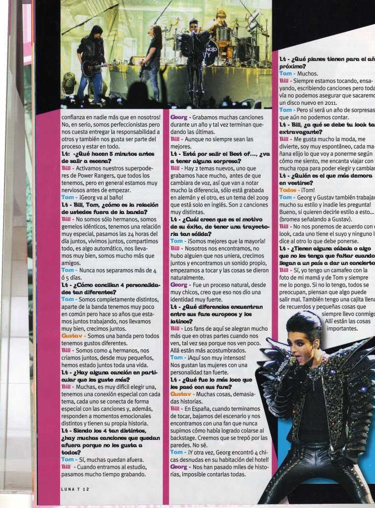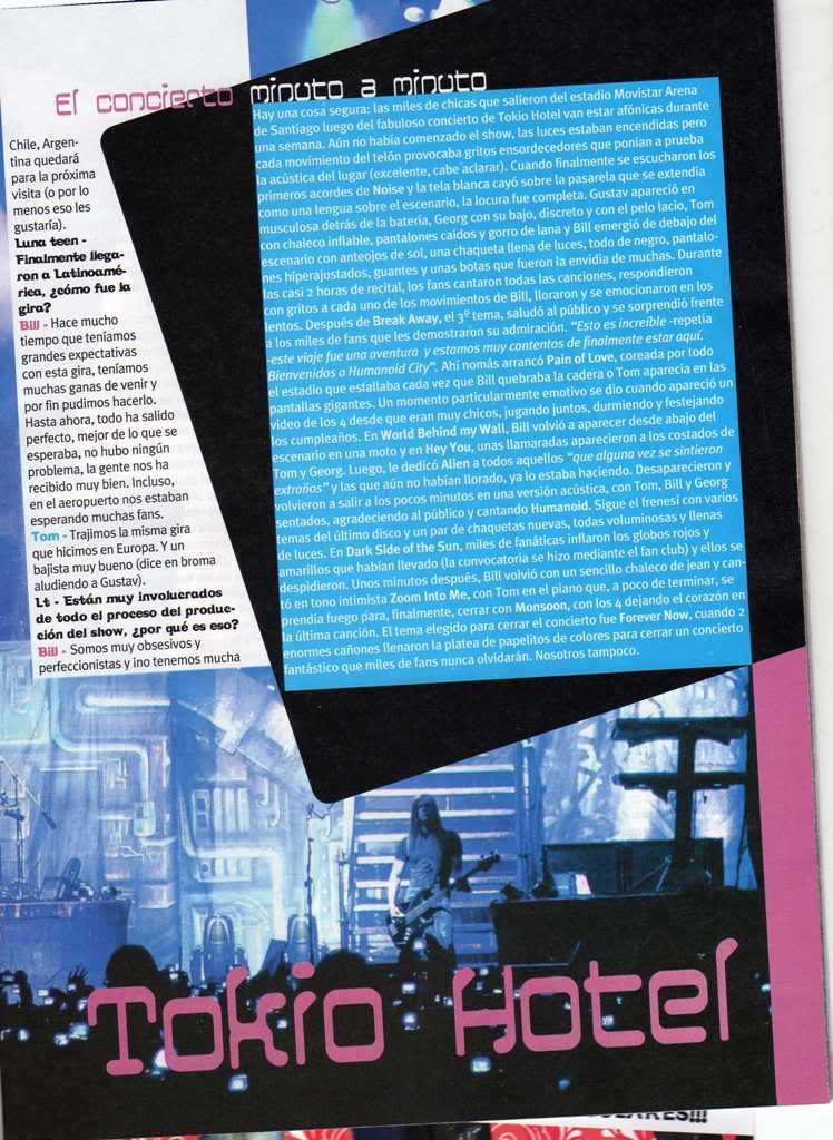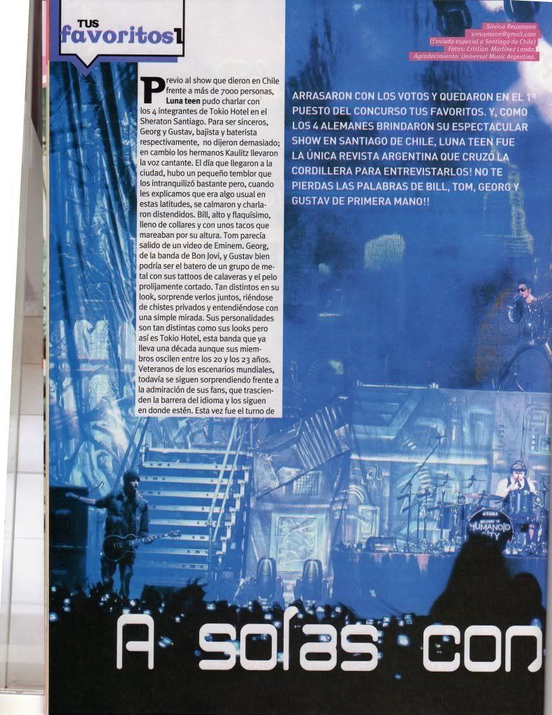 Antes do seu concerto no Chile em frente a 7000 pessoas, a Luna Teen, pôde falar com os 4 membros dos Tokio Hotel no hotel Sheraton em Santiago. Para ser honesto, Georg e Gustav, baixista e baterista respectivamente, não falaram muito; os gémeos Kaulitz tomaram as rédeas da conversa. No dia em que chegaram houve um pequeno tremor de terra que os deixou um pouco desconfortáveis mas, quando lhes explicámos que era algo comum por estas latitudes, ficaram mais calmos e descontraídos. Bill, alto e magrinho, cheio de colares e uns saltos que nos deixam tontos devido à sua altura. O Tom parece saído de um vídeo do Eminem. O Georg parece saído dos Bon Jovi, e o Gustav poderia ser o baterista de uma banda de metal com as suas tatuagens com caveiras e o seu prático corte de cabelo.